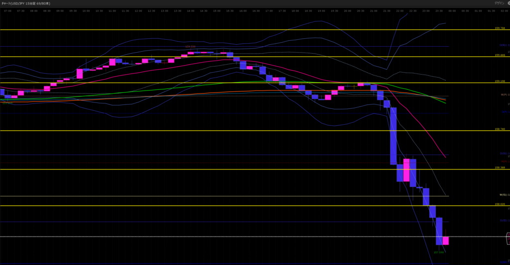 ・21時30分頃の急激な反応:週末を控えた冒険者たちによる大規模な撤退行動(ポジション調整の売り)の影響で、約40pipsの突風(急落)が発生。