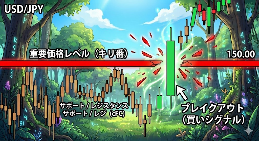 - 絶対防壁(キリ番・ラウンドナンバー): 150.00や149.50など、キリの良い数字です。多くの冒険者が防壁(サポートライン)や目標(レジスタンスライン)として意識する巨大な城壁です。