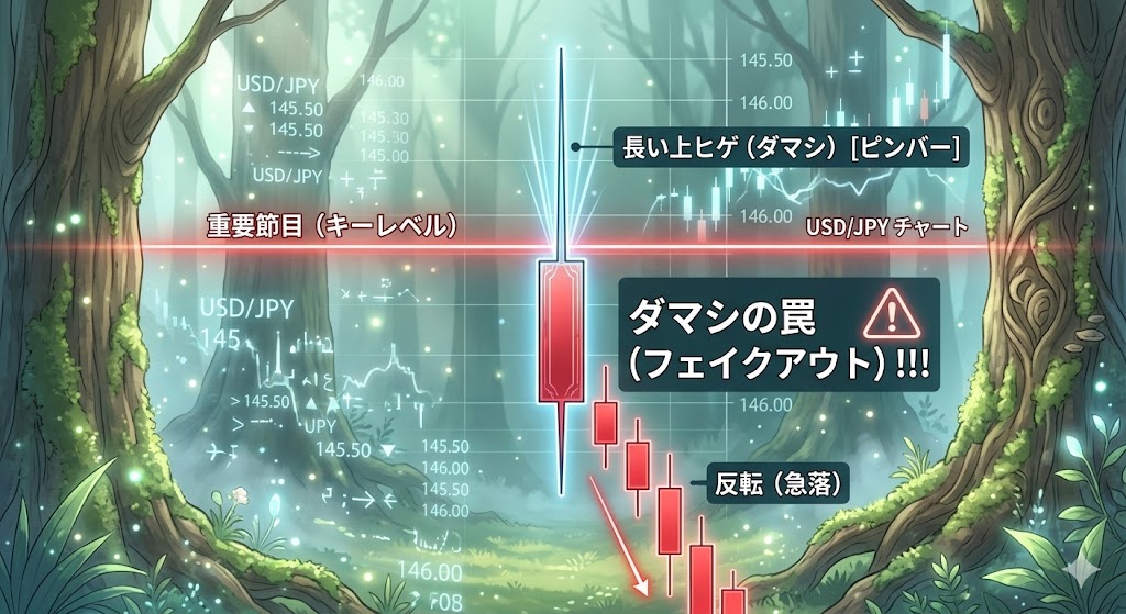 - 幻影の罠(ダマシ): 防壁を突破したと見せかけて、すぐに元の価格帯へ引きずり戻される現象です。節目は「絶対に反発する壁」ではなく、「破られた時の反動が巨大になる場所」として警戒する必要があります。