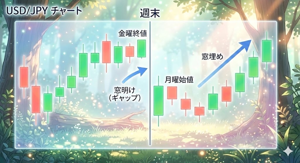 - 空間の歪み(月曜日の窓開け): 週末の間に起きた出来事を織り込み、月曜日の夜明け(開場)とともに価格が飛んで始まる現象です。この歪みは埋まりやすいという性質(窓埋め)がありますが、過信は禁物です。