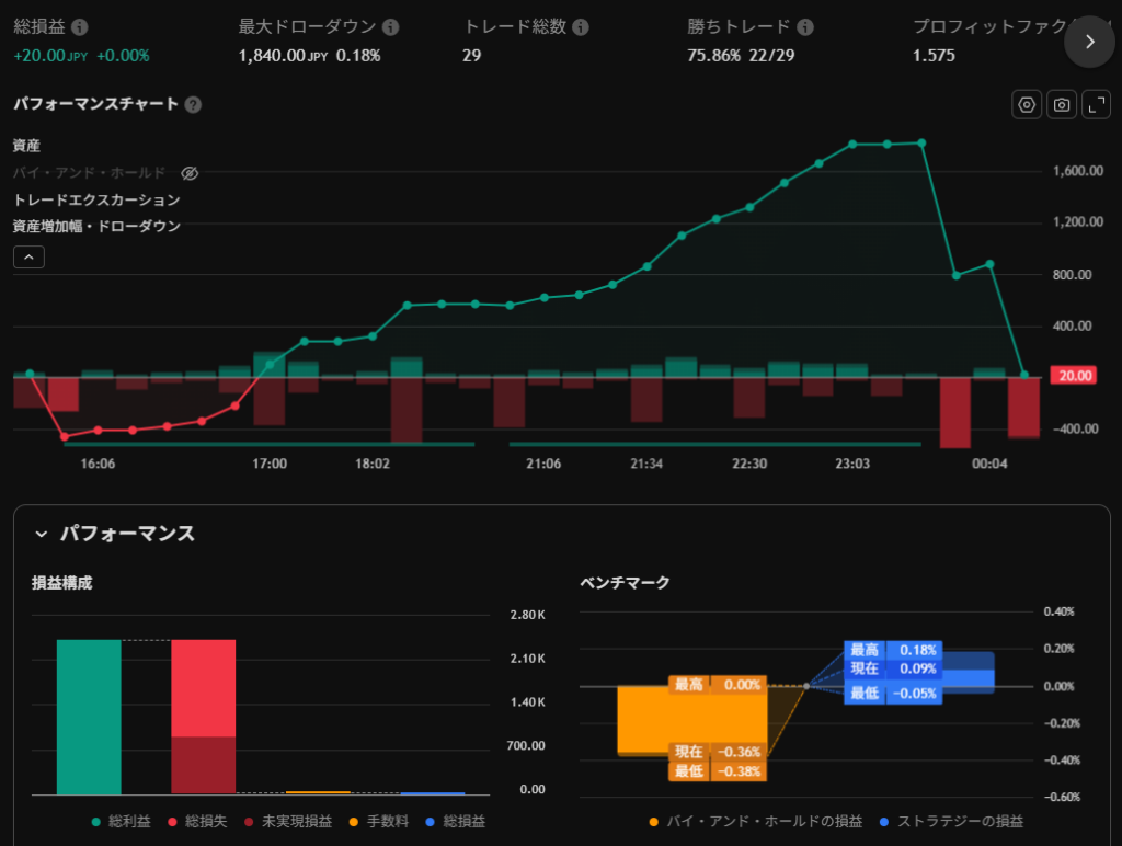 - 勝率:75.86% (計算:22勝 ÷ 29トレード)