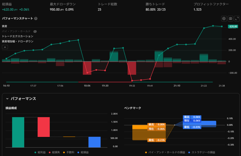 特筆すべきは、19:30を過ぎてからのNoriの立ち回りです。一度深手を負いながらも、決して熱くならず、再び「LegendPrime」の託宣(シグナル)に全幅の信頼を置き、21:10以降の連続討伐で見事にプラス圏へと再浮上。最終的にはPF 1.525という、軍師も納得の安定したリザルトで幕を閉じました。