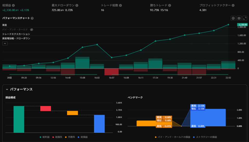 • 勝率 93.75% (計算:15勝 ÷ 16トレード)